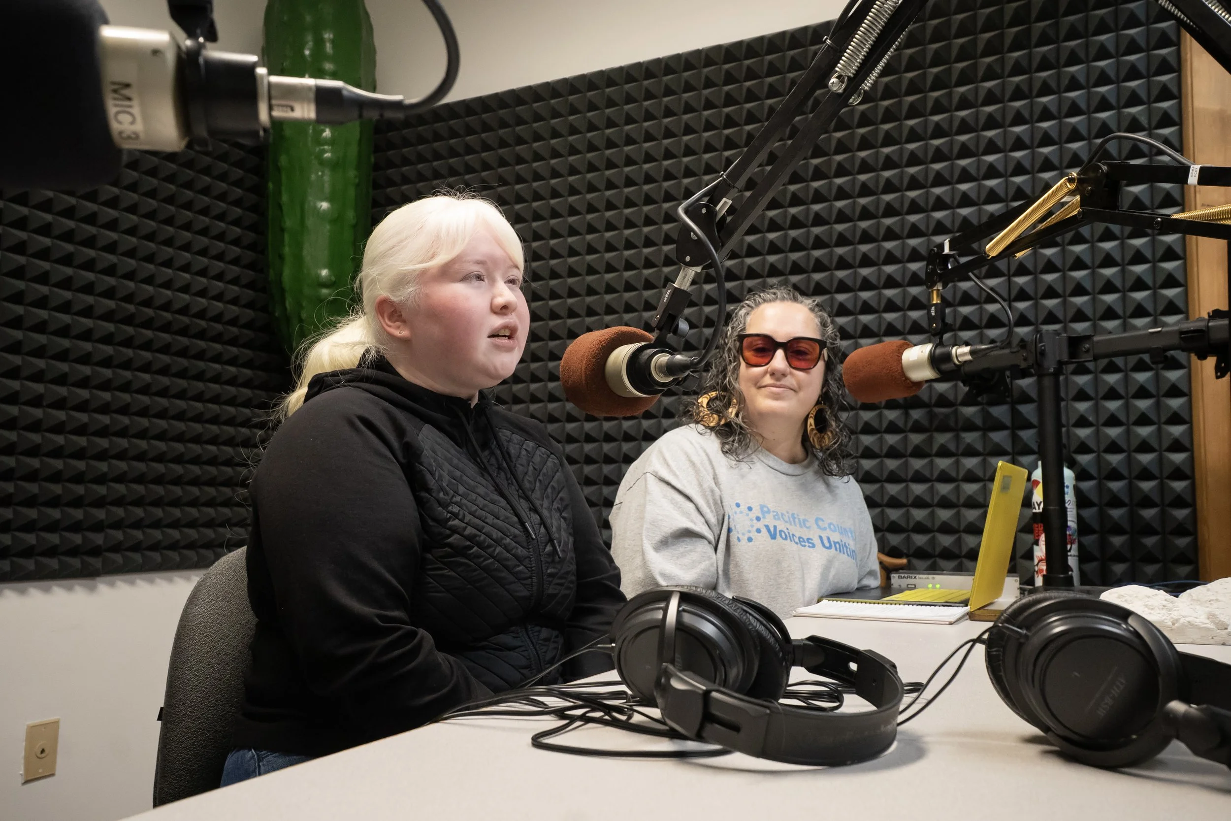 Daisy Delgado speaks about disability justice during Local Matters with host Johnny Mason on KMUN 94.7 FM, Thursday, Oct. 16. PCVU Executive Director Bethany Barnard is at right.